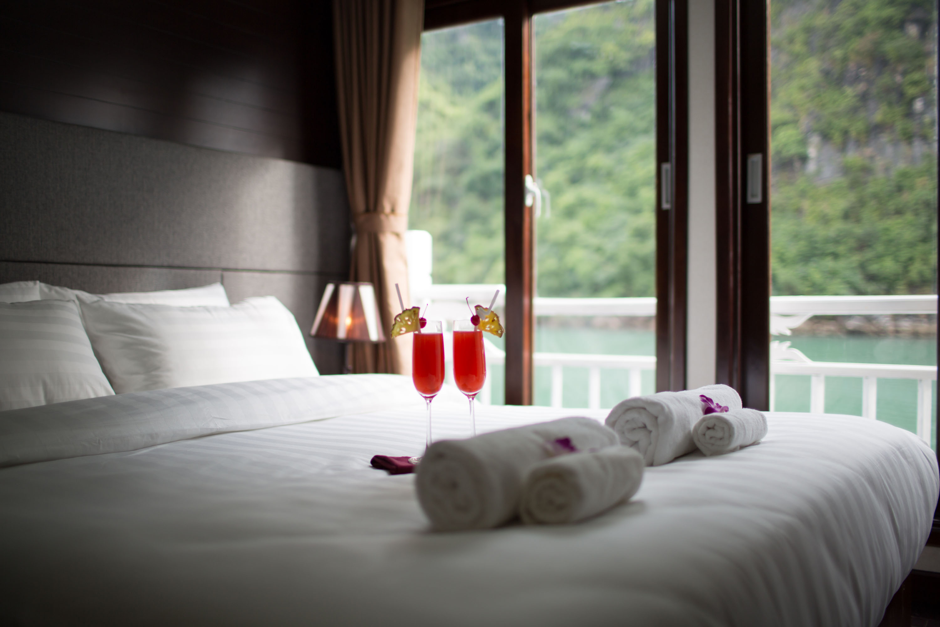 DAY 1: (Your hotel – Tuan Chau marina - Halong bay - Lunch – Maze cave – Isolated peaceful lagoon for swimming – Local wine appetizer – Dinner – Onboard night activities)