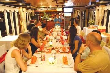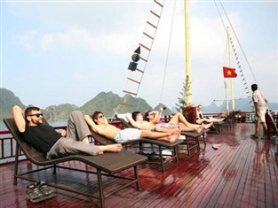 Dining area is designed to serve 30 customers at the same time. The cozy restaurant is marked with wooden tables and chairs, LCD screen and karaoke for entertainment. The bartender always makes the bar atmosphere exciting and attractive with music and colorful lights. Traditional Vietnamese foods and Western dishes are both available. Those who love to have an outdoor meal can choose a seat on the sundeck and enjoy tasteful dishes while cruising through poetic Halong Bay.