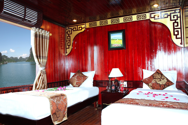 Halong Deluxe Dragon Cruise offers 03 Deluxe Tripple cabins, 04 Twin cabins and 03 Double cabins. Each cabin is well-equipped with a private shower bathroom, water heater system and air conditioner. The harmonious combination among wooden carvings and lantern inspires customers’ classic impression. You can relax in your room and enjoy the splendor of the site through panoramic window.