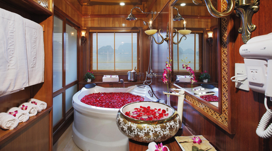 Make your great choice for a luxury stay at Royal Wings Cruise in Halong Bay with Royal Executive room. This's surely the best for a real romantic and impressive holiday in Halong Bay. Locates in higher floor, all room provides with large window open to the panoramic view of the bay and sea. Spacious room size from 26sqm with double Jacuzzi bathtub, large flat TV with Movies & entertain programs are the best experience for all guest. King bed or Twin bed room are available upon guest request